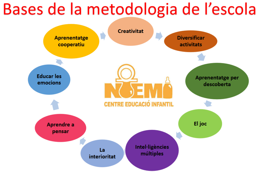 La metodologia de treball partirà d’experiències, activitats i jocs, desenvolupats en un ambient d’afecte i confiança, i amb activitats globalitzades d’interès i significat per a nens i nenes. A l’hora de plantejar les activitats i la distribució dels espais de les aules tenim molt en compte la teoria de les intel·ligències múltiples.
