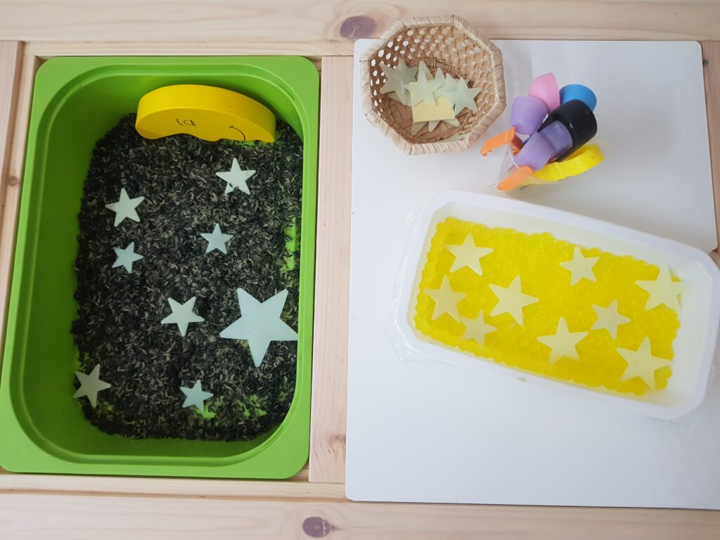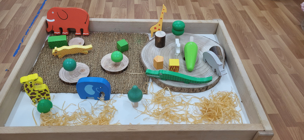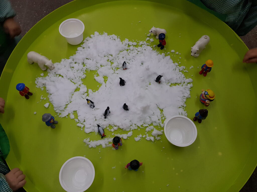 Les safates d’experimentació permeten manipular materials diversos (arròs, sorra, farina, llegums, etc.) amb estris com embuts, culleres o tubs. A través d’aquest joc, els infants desenvolupen habilitats sensorials, lògica-matemàtica i llenguatge, tot mantenint una actitud de respecte i col·laboració amb els companys.